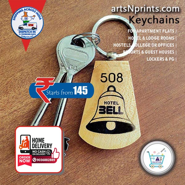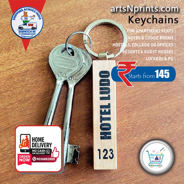 Elegant wooden hotel keychains in Odisha, crafted for hotels, lodges, guest houses, and resorts. Durable, eco-friendly, and customizable with room numbers or branding. Designed by artsNprints.com with quality finishing and fast delivery across Odisha and India. Perfect for bulk orders and hospitality needs.